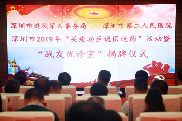 8月1日下午,深圳市退役军人事务局在深圳市第二人民医院举行“2019年‘关爱功臣送医送药’活动暨‘战友优诊室’揭牌仪式”。市退役军人局党组书记、局长张悦华、党组成员、副局长朱锋,市卫健委、市第二人民医院等相关单位负责人,以及退役军人、优抚对象代表150余人参加揭牌仪式。