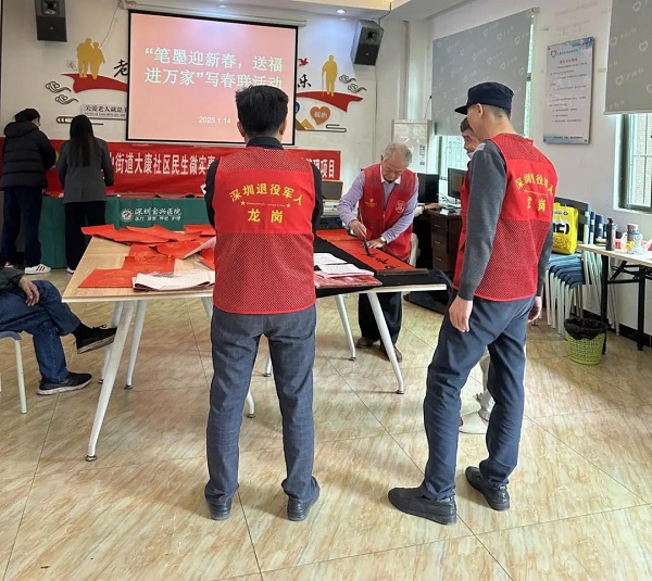 1月14日,龙岗区园山街道退役军人红星志愿服务队书法爱好者参加大康社区“笔墨迎新春,送福进万家”2025年新春送春联活动,现场为辖区居民和员工书写春联并送上新春祝福。
